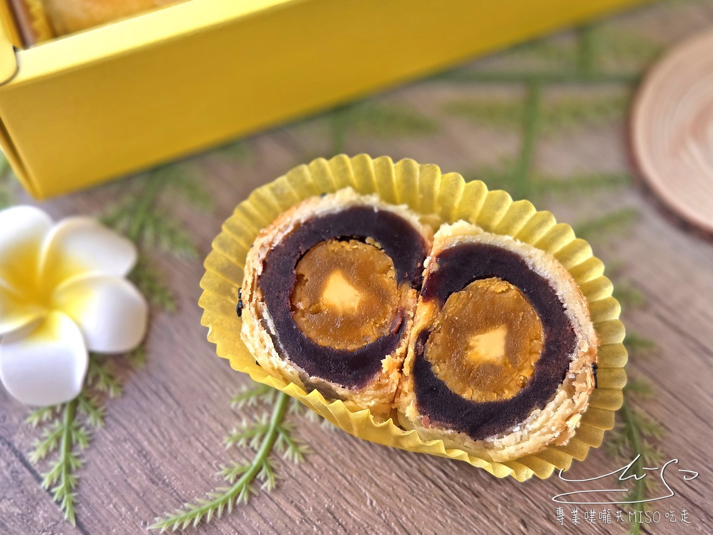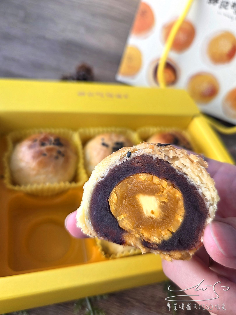 蛋黃酥切開的那一刻真的超誘人!外層的酥皮層層堆疊金黃酥香,中間的紅豆餡細緻綿密看得到,包著飽滿的鹹蛋黃,橙金色澤看起來又香又濕潤!