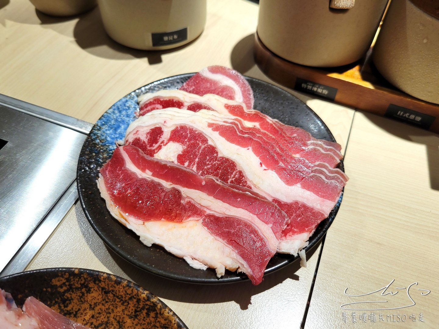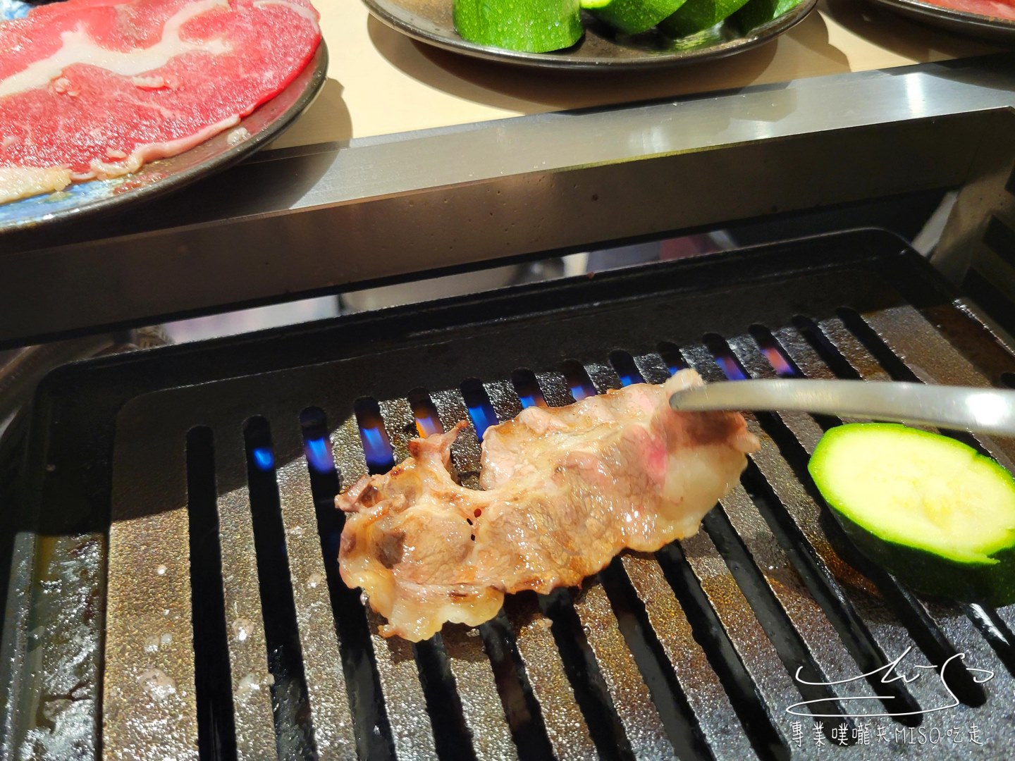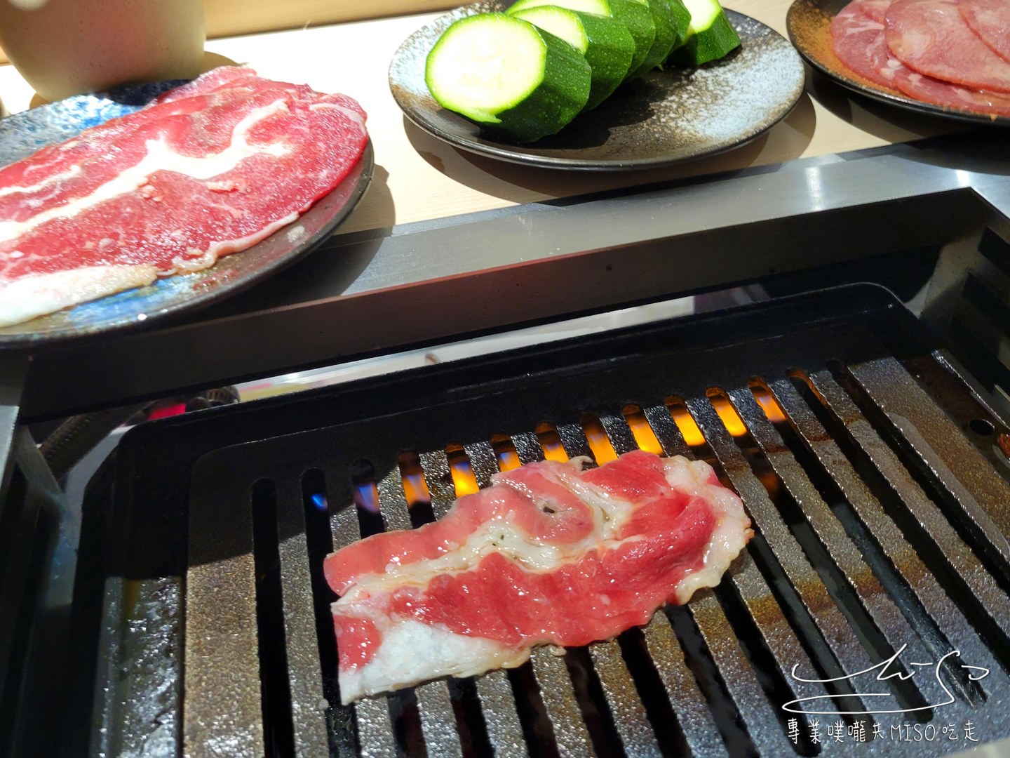 薄薄的牛五花油花分布細緻均勻,放上烤爐油脂慢慢融化,熱氣逼出,發出「滋~」的聲響,細緻油脂慢慢滲入肉片,香氣瞬間撲鼻而來