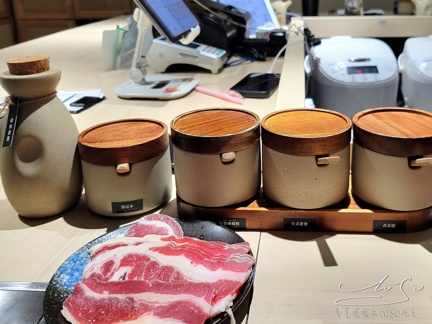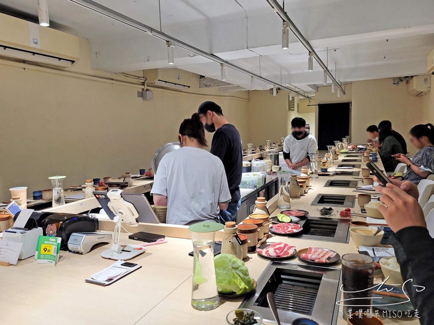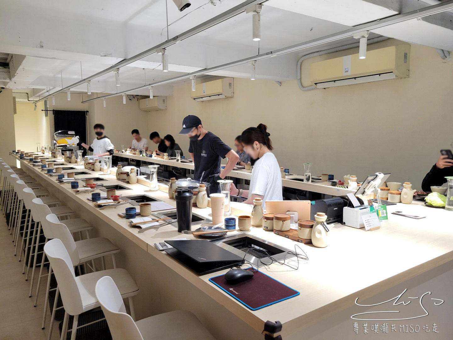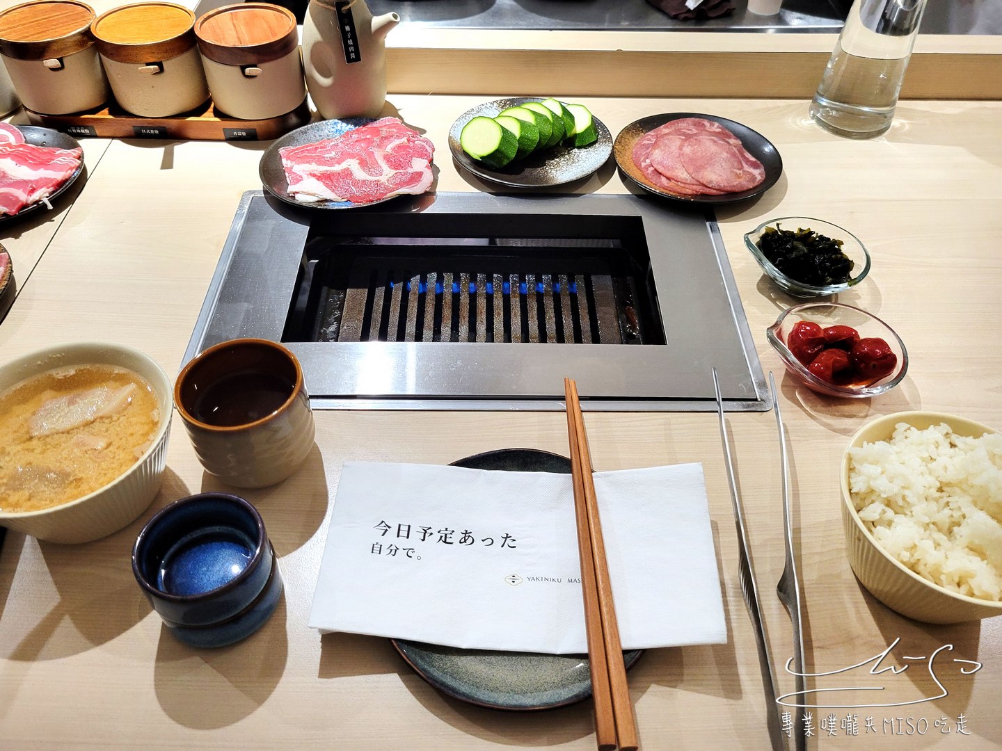 踏入燒肉政宗店內,映入眼簾的是明亮俐落的日系極簡空間,整排環繞式的吧台設計,一人一爐的座位配置,讓客人能專心烤肉、自在用餐,不受他人打擾,桌面上整齊擺放著餐具、醬料小陶壺,散發出一種低調的職人感